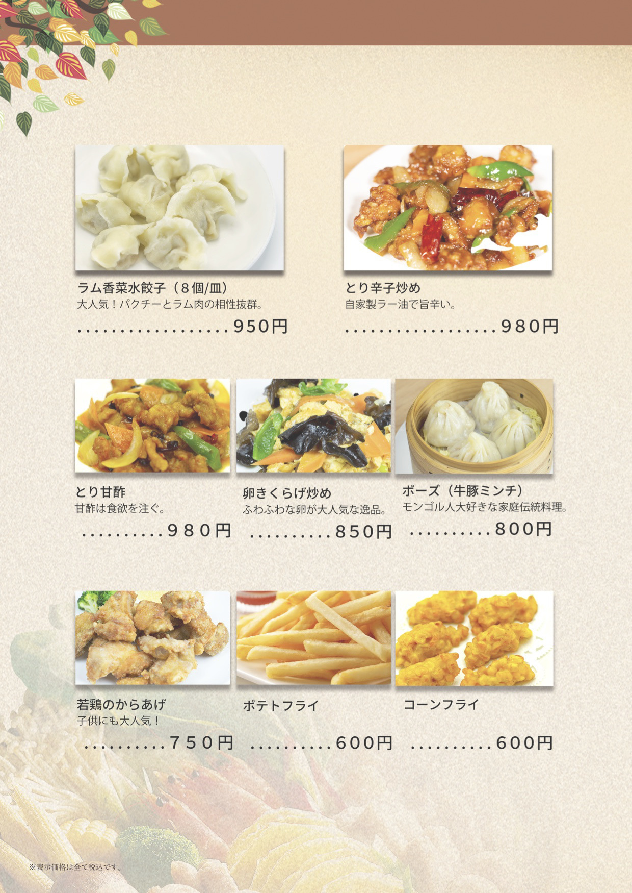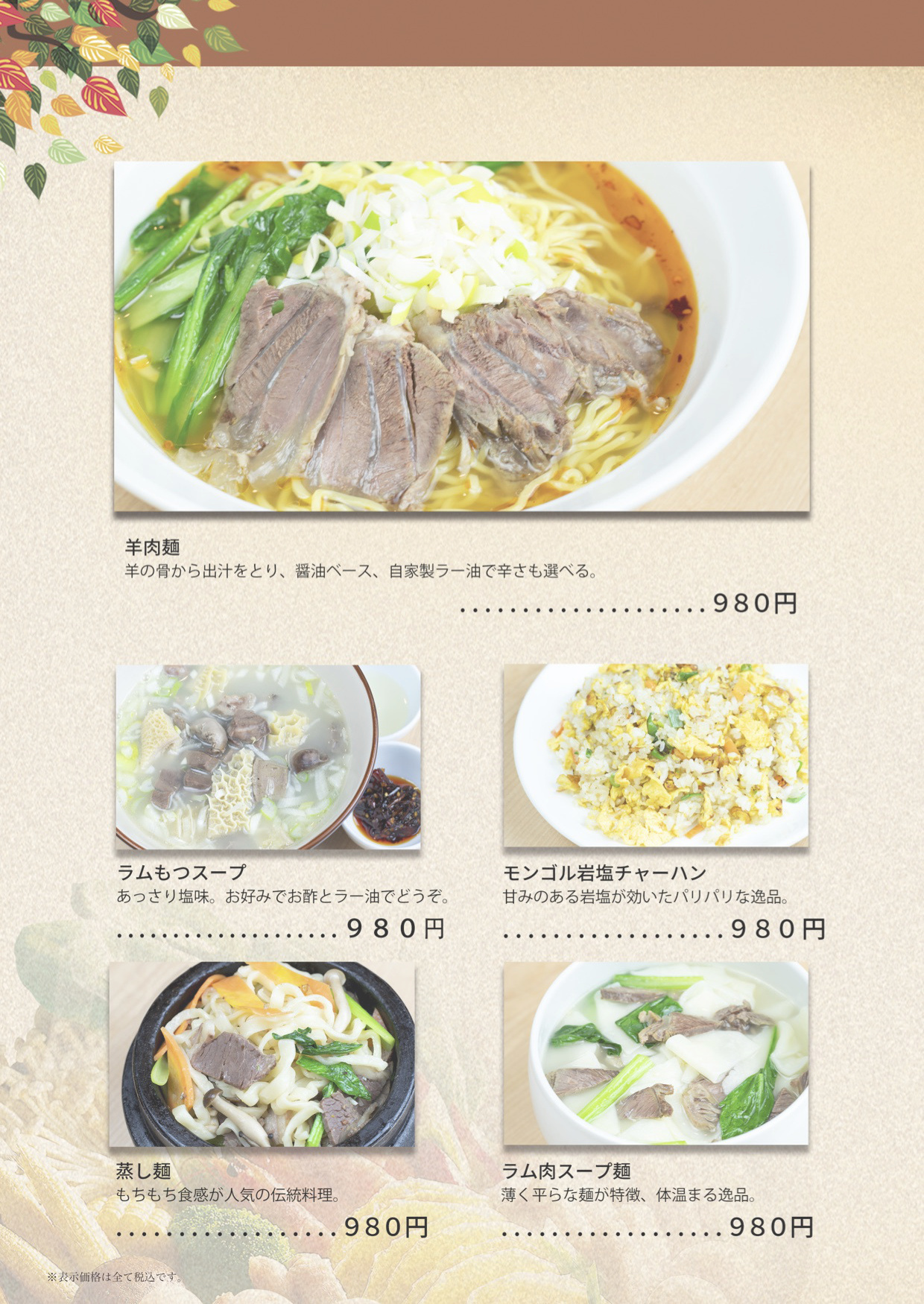 新鮮な野菜と注文を受けてから麺を手打ちするモンゴル蒸し麺はモンゴルのお相撲さんにも大人気。他にもラムの骨で煮込んだスープ、スペアリブなどに使う当店特製のタレなど安心で美味しい人気メニューがたくさんあります。